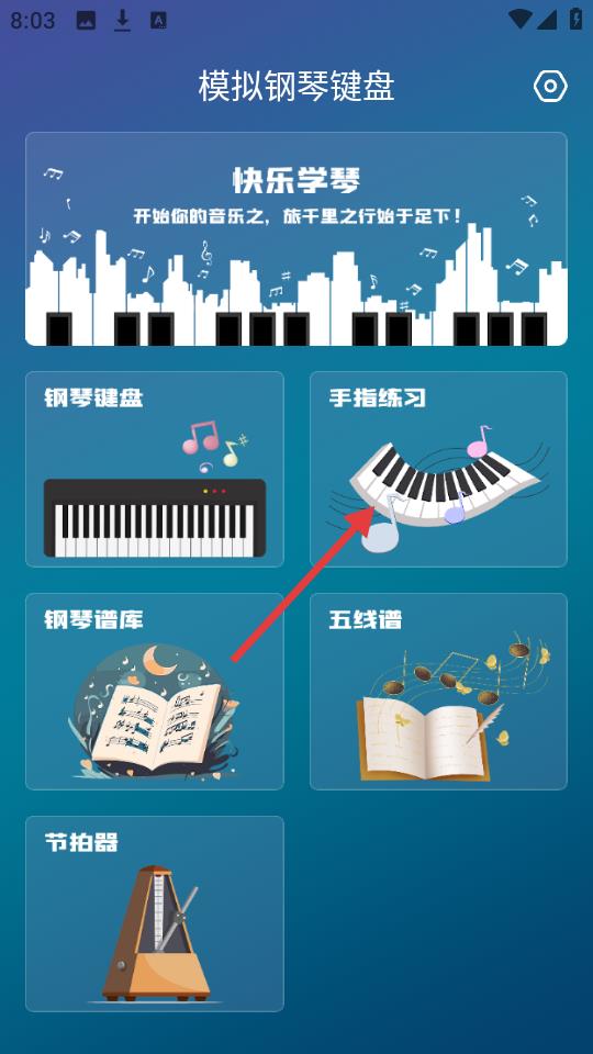 模拟钢琴键盘游戏如何练习1、主界面点击手指练习,锻炼手指灵活度。