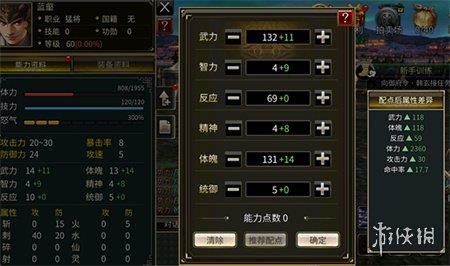 4、提升武将后可获得属性点,玩家可以自由选择分配,或者使用一键推荐加点功能,快速完成属性分配。