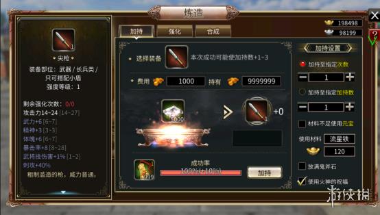 玩家可在炼造房中对武器和防具进行加持,加持可提升武器的攻击力和防具的防御力。