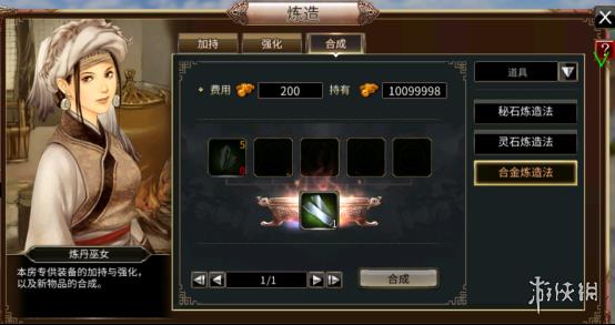 进行装备合成时,可消耗指定的素材和铜钱以取得合成成品。基础的合成素材,如秘石碎片、灵石碎片、合金碎片或铁、钢等,可通过击败副本头目,以及偶尔会出现在比武场的宝箱王获得。