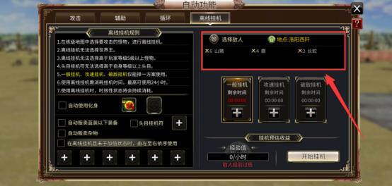 ③若角色撤退,或没有剩余时间、离开游戏时都将不开启自动离线挂机。