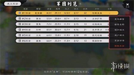 在军团列表中,玩家可以进行更改都督、修改军团名称、增加或减少军团内城池等操作。