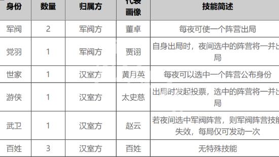 2、汉室方:需将三个军阀方阵营(军阀×2、党羽×1)全部投票出局。