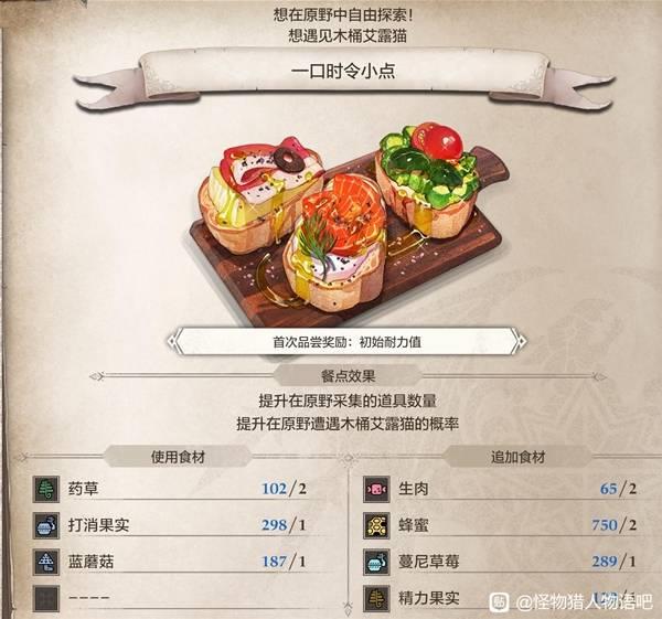 吃如下食物,然后去八龙峰这个点位刷木桶艾露猫,记得提前带好铳枪姐姬特。