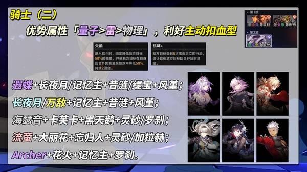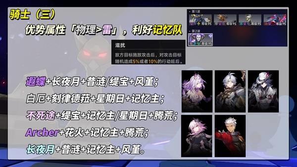 骑士(一)优势属性「火>物理」,敌方存在量子抗性,但可高速量子队可解除此效果。关卡负面“开局2层10%伤害降低,每次施放终结技减少1层”。