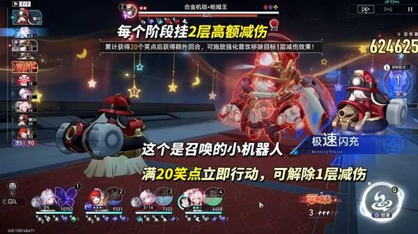 第2波“帕姆王”机制很纯粹,每个阶段都会给自己添加2层减伤效果,此时会给我方召唤1个合金帕姆,累积20笑点时立即行动降低1层帕姆王减伤。