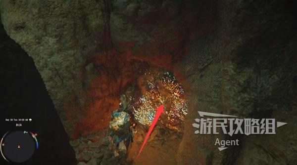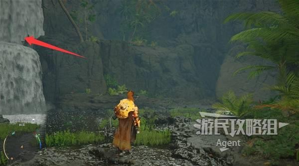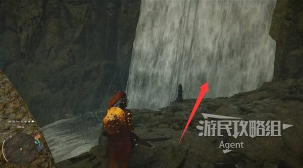 瀑布右边有个大石块,进入缝隙到石块后面,用技能“劲法:凝神”打碎彩色石头,进去开宝箱拿到【金色欲望板金鞋子】。