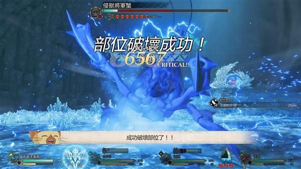 在第二回合时,切青电主使用电磁炮S,攻击侵兽镰蟹背部部位。同样只要上面咱的要求都达成了,能造成2900 ~6000 的伤害(根据是否暴击、DEBUFF、有无猜拳等有差别),咱最高爆出来9999伤害上限完成成就,咱都不知道是怎么机缘巧合爆出来的。同样只要达到输出1700 以上就能让侵兽镰蟹的背部部位被破坏进入倒地模式。