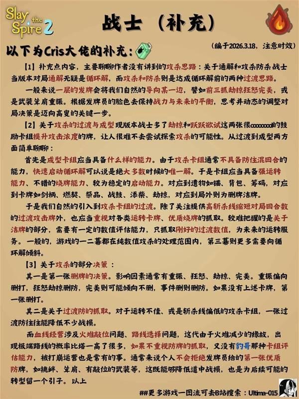 《杀戮尖塔2》的战士,开局就能用,玩起来也挺好上手的。要是你正琢磨怎么用他打得更顺手,可以瞧瞧玩家“Ultima-015”整理的这份卡组搭配思路,我觉得挺有参考价值的。