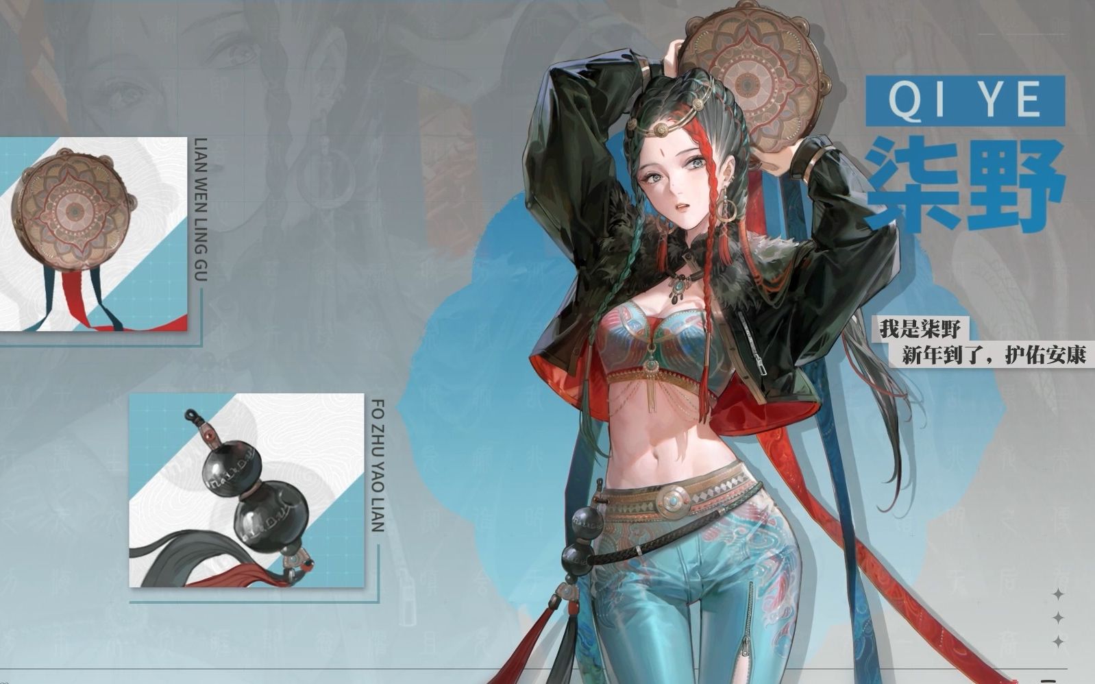 第四位要介绍的角色叫柒野,她的发型也是偏传统风格的两络麻花辫,还有额头前的额式,一缕红色的头绳,这些苗疆少女的元素风格使人物的形象特点更加鲜明了,柒野的造型也比较奔放大胆,一双略显迷离的眼眸万种风情自不用说,看得出来这也是官方十分重视的角色之一了,从她充满少数民族异域风情的特色装扮来看,不知道是一位怎样的角色呢?