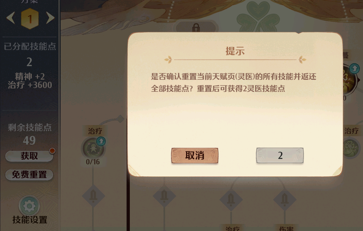 重置技能的方法就是通过主界面右边的“技能”点进相应的技能界面,之后再点击左侧的“免费重置”即可实现技能重置,点击之后它会弹出一个提示问你是否确认重置,并会如下图这样告诉你重置之后会发生的事情。