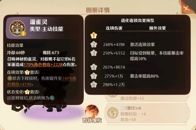 在技能方面的话,表现的也是非常不错的,憨特会召唤出一个神秘的帮手,雀灵会对瞧不起它的6个敌人造成170%的角色物攻和额外2228点固定伤害,同时这个角色在强化到3星的时候会解锁眩晕效果,而且攻击技能会让暴击概率提升50%,这个效果最高可以提升到80%,伤害非常的恐怖。