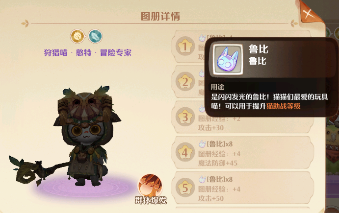 猫灵的全名叫【狩猎喵·憨特】,这个猫灵的属性是【冒险专家】,技能方面属于是一个群体爆发伤害,在属性强化方面主要是以【魔法防御】【攻击】这两个为主要的,比较适合身板比较脆的射手或者奶妈来使用,但是这个紫色猫灵也可以搭配前排有伤害的盾卫,算得上是一个万金油型的猫灵吧!