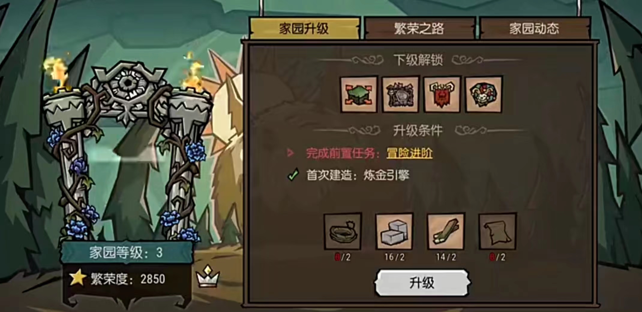 如果玩家想要升级家园的话,需要满足几个条件,首先需要玩家去完成前置任务,游戏里面有非常多的挑战,而这些都是和家园有着密不可分的联系的,只有将这些挑战全部完成了以后,才可以达到相应的冒险指南任务,之后只需要跟着冒险指南去完成一下相关的任务,以及要求就行了。