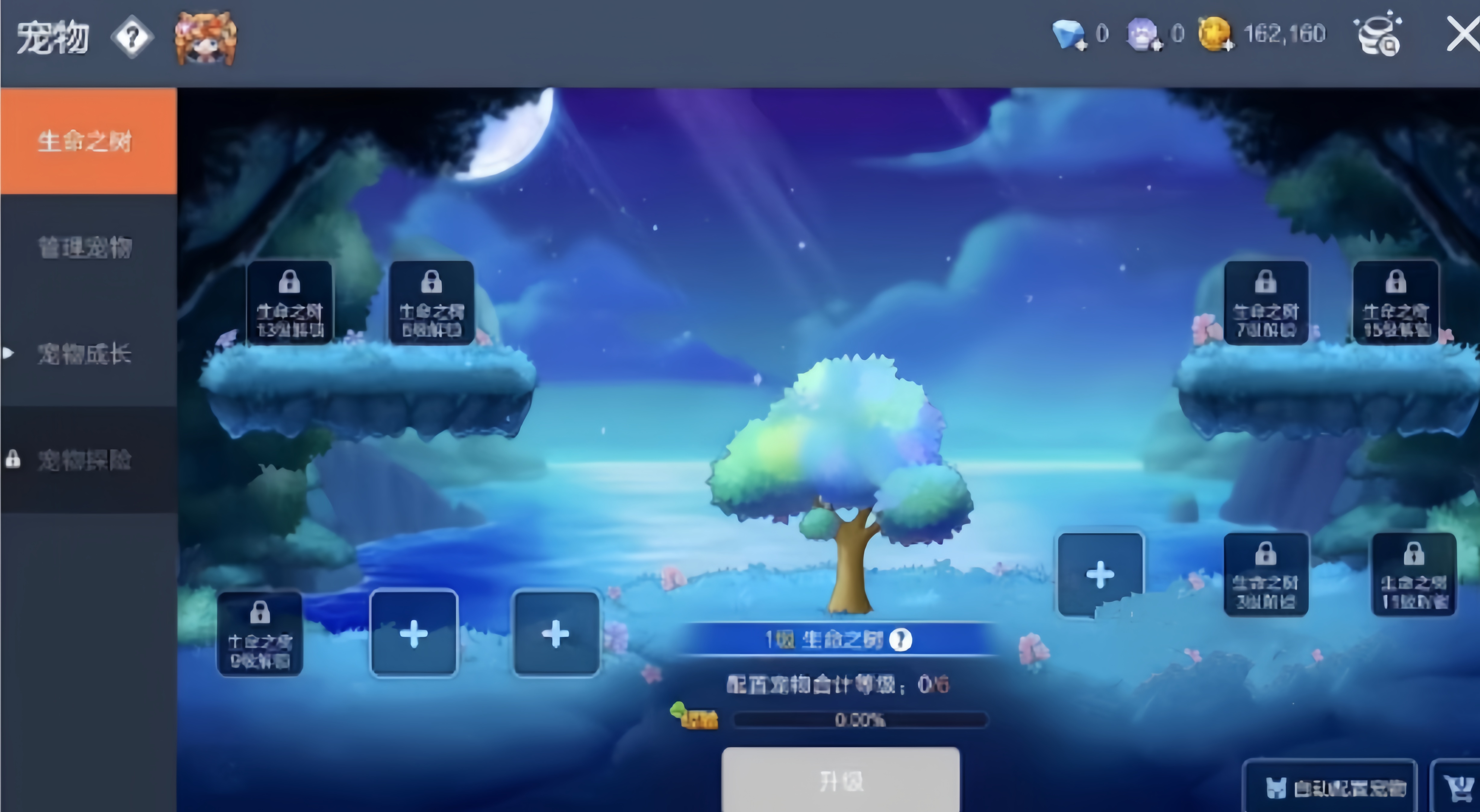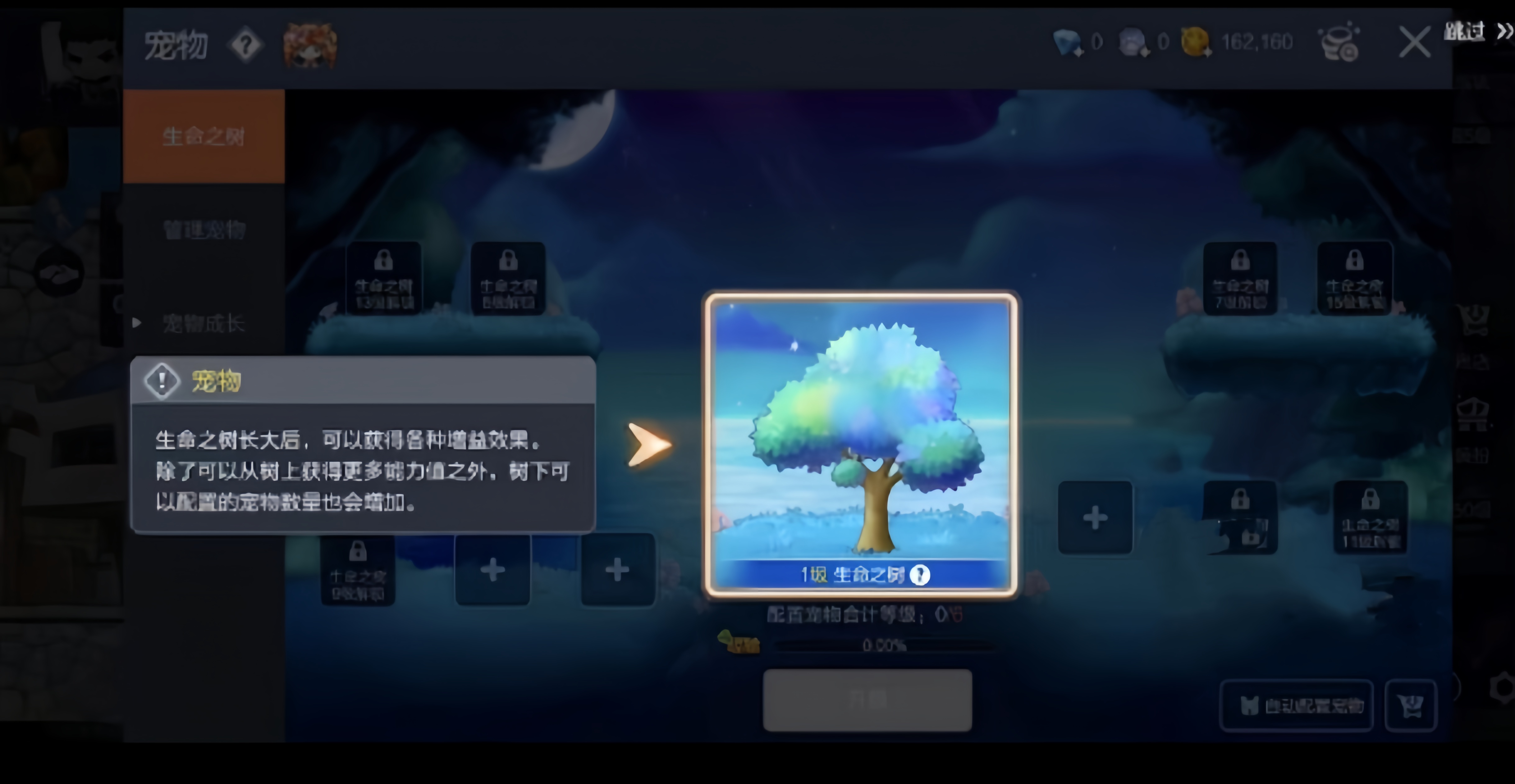 在面板之上还有一颗生命之树,玩家们将宠物移在生命之树上培养,能够让生命之树的能量场慢慢变大,而能量指数的功能就是为游戏的角色增加增益效果,随着生命数的增长上面能够放置的宠物数量也会随之增长。这一设置既可以帮助玩家们角色进行增益,也可以让生命之数加快生长,让宠物的生长速度也加快,是一个非常好的功能。