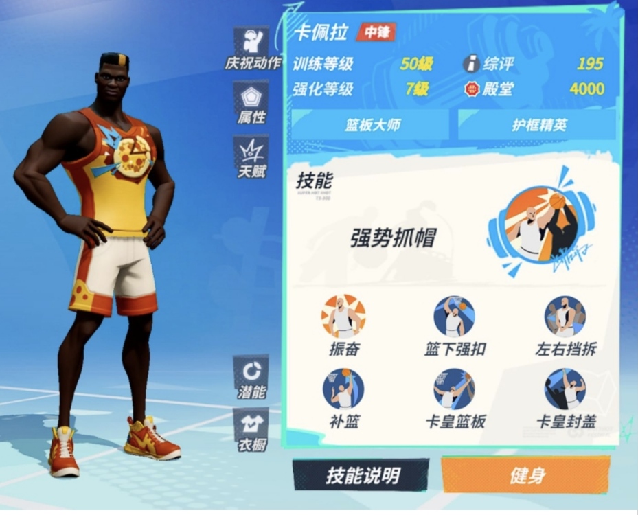 卡佩拉在游戏无论是得分能力以及各种防守能力都是一流的,合理运用好它的潜能可以打出不一样的效果。他的技能主要是集中在内线区域当中的,主要方面就是进攻以及扣篮,同时在防守能力上他做的也是十分不错的,比如最基本的抓帽以及左右格挡和封盖等等都非常不错。