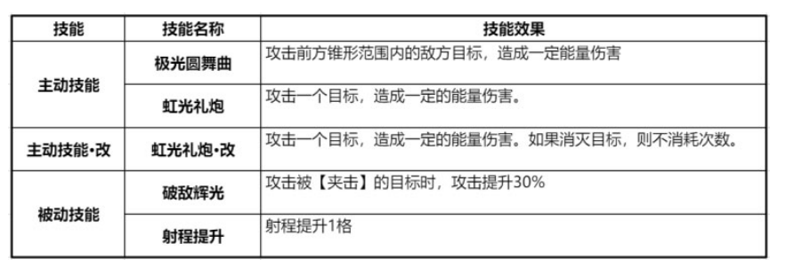 破敌辉光作为被动技能要求我们命中尽可能多的怪物,以显著增加欧若拉的伤害。这对欧若拉来说尤其重要,因为攻击伤害增加30%这一点会影响是否能够击败敌人的能力。火力特勤的技能都是伴随着群体攻击而来的,不难看出欧若拉的能力可以在所有能力中最基本的条件下攻击最多的领域,但对单个网格的伤害并不高。对比五星级角色弧月来讲,攻击方位更加的广泛。