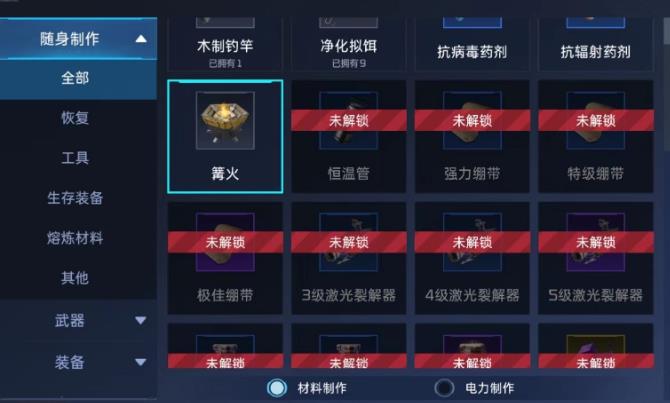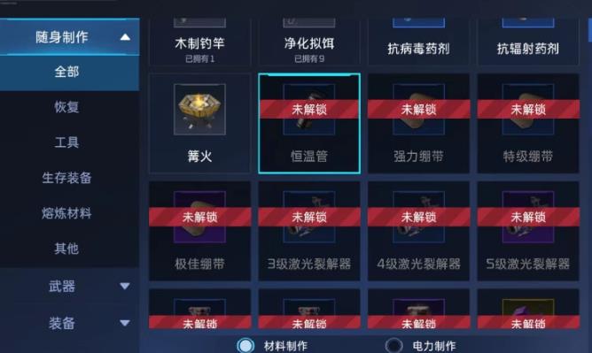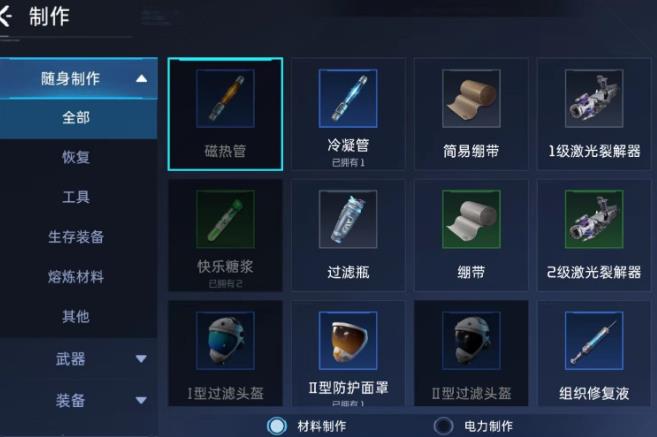 磁热管的材质有拉链、螺丝、透镜、麻布等,你们多做点,放在背包里就能一直发挥作用。至于恒温管,则是由二极管、精密零件、电子元件以及荧光草纤维等制成,既能抵御严寒,又能抵御高温,所以不管是在什么温度下,都能正常工作。另外,生起一堆火堆,既能烤肉,又能晒干衣服。营地所用的材料都是木头和石头,在游戏初期就能很容易的制造出来。