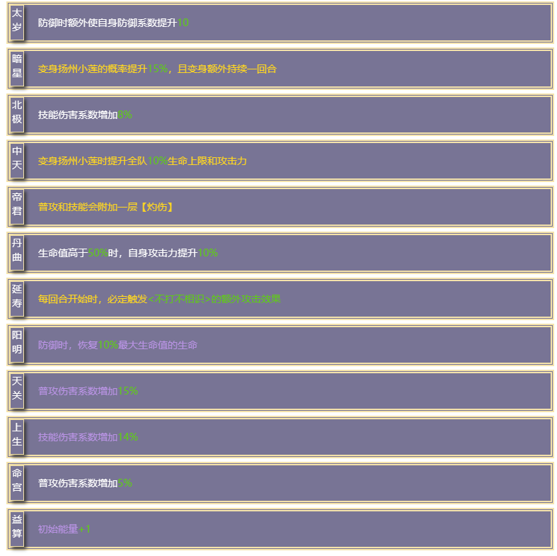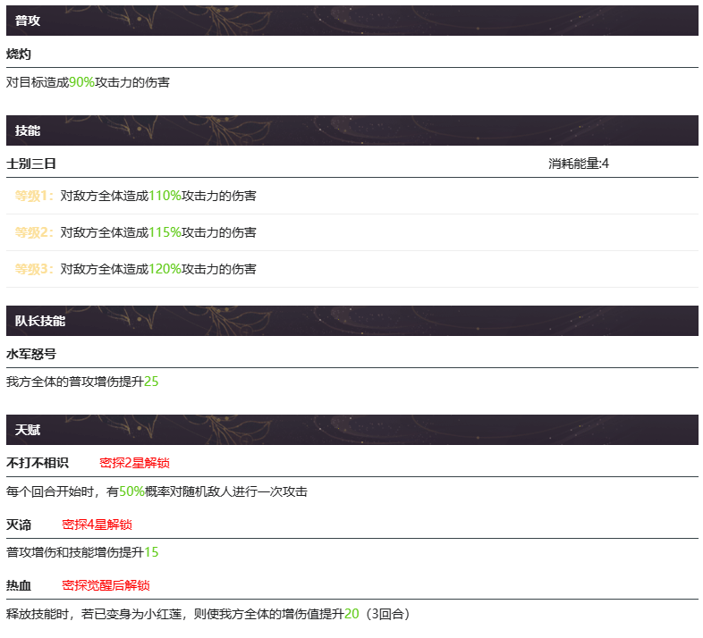 不打不相识可以使他每个回合开始时,有50%概率对随机敌人进行一次攻击。灭谛可以使他的普攻增伤和技能增伤提升15%。热血可以使他释放技能时,若已变身为小红莲,则使我方全体的增伤值提升20%(3回合)。