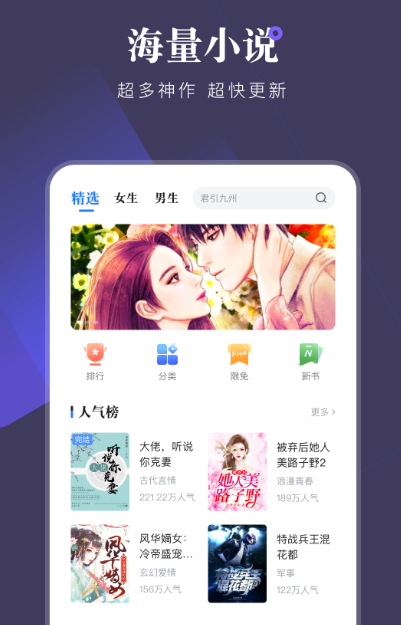 目前使用这款软件的人群高达上百万,可观看到各种不同类型的小说,不仅支持国内小说作品,同时还有海量的国外小说作品,能满足大家对小说作品的热衷,拥有众多实力派的签约作家、及知名作家齐聚到该软件上,在阅读书籍的同时,可了解知名作家写作风格,如果有热衷写作人群,也可到该软件上学习。