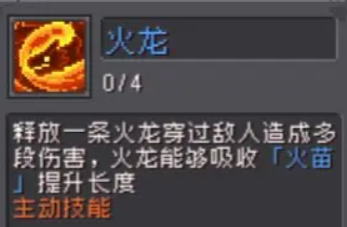 火龙,将火元素聚集,构造成龙的形状释放出来,从而穿过敌人来造成多端伤害,同时火龙可以吸收其余技能所产生的“火苗”,来提升技能的攻击距离,从而做到远距离打击。但由于技能是释放后会陷入12秒的冷却时间,所以需要把握好技能的释放。
