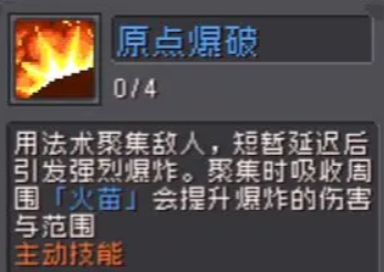 原点爆破,基于法术强度造成4倍的火焰伤害,是火焰术士伤害最高的技能,在释放后会将敌人聚集,并且经过短暂延迟后产生大爆炸。与此同时,之前技能产生的火苗便起了大作用,在聚集敌人的同时,也会吸收周围的火苗,进一步提升爆炸的范围与伤害。