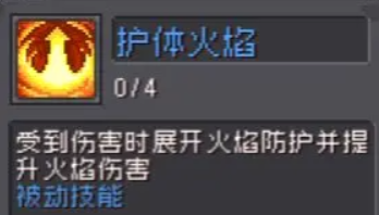 护体火焰,在遭受敌方攻击的时候,会展开火焰进行自我保护,在护盾展开的这三秒内,玩家的防御率会有所提高,并且会获得百分比的伤害减免,最主要是还会提高火焰伤害加成,玩家需要在这三秒内尽可能的进行输出。