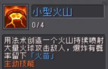 小型火山,正如其名字一般,释放后会创造一个火山对敌方单位造成持续伤害,在火山存在的时间里,火山会按一定频率爆发出火球对敌人进行攻击,在攻击的同时有一定概率产生“火苗”。