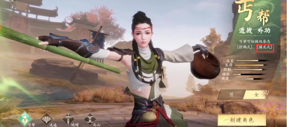 当玩家通过升级后开启形态的瞬间切换。除了一般的普攻技能外,在丐帮这个角色中还有两种不同的选择:控鹤式和擒龙式。这两类武功类型在打斗风格上存在显著差异。控鹤这个武功风格的主要特点是其强大的恢复能力适合长时间打斗,适用于需要持续性能的作战情况。所有的技能都很适合竞技群殴