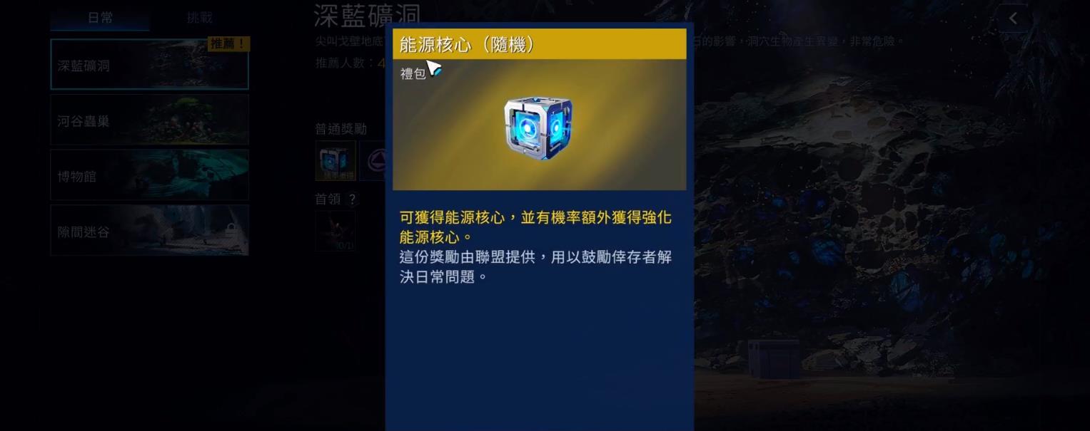 在副本里,玩家要面对的是一只沙虫,只要干掉了沙虫,玩家就可以得到相应的奖励——一颗橙色的能量之核。不过,这种能量的效果是随机的,只有在得到了能量之核之后,才会被判定为能量之核,所以,这两种能量之核对于玩家来说,都是非常重要的东西。除此之外,还有一些普通的宝箱和联盟点数。