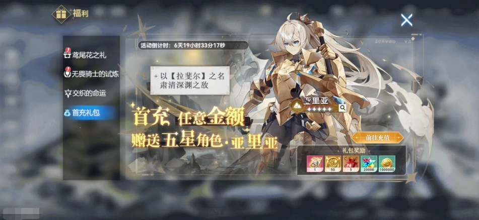 抽奖的次数如果大家前期不想在卡池里面进行充值的话,也可以利用礼包来查看,这里推荐的就是首冲礼包,只要6快钱,这个首冲礼包大家不仅可以获取五十抽的免费奖励,还会赠送一个五星角色,里面还有一些其他的小材料,后期可以给角色升级使用,在买到首冲的礼包之后大家的战力提升也会非常快,六元礼包魔瞳的赠送还是很香的。