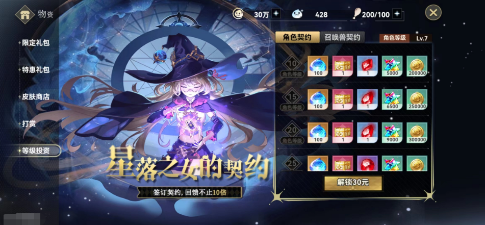 其次的话还有一个等级礼包,这个等级礼包它的价格稍微要比首充礼包要贵一点,这个等级礼包是需要30块钱的,但是其中里面的钻石返利的数量非常香,算是目前钻石数量的天花板,而且还有大量的经验奖励以及金币可以获取,买完这个礼包之后大家后期可以不用去重复的刷那些副本,而且在返利上面可以说是所有的礼包里面给到最性价比最高的一个,大家要是氪金的话这个礼包跟首冲是闭眼买的。
