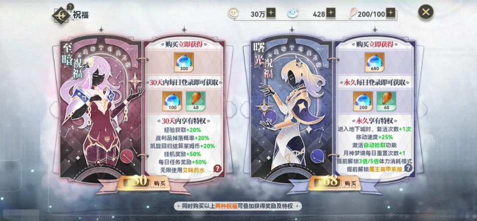 如果不买这个的话建议大家去直接买永久卡,时光祝福这个永久卡只要一次68,但是是可以终生使用的,68比上面的128要便宜很多,拥有这个永久卡以后大家每天都可以多刷一次副本,领取的材料以及钻石都也会有多出来的一部分,而且自动拾取功能也是通过这个永久卡来解锁的,在大家没有额外的格子装装备的时候也可以解锁这个永久卡,所以很多氪金玩家都会买这个卡,毕竟68块钱带来很多的用处真的算是非常划算了。