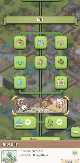 玩家们在地图等级等级到4级的时候就可以在右下角找到熊猫的图标了,点击图标后进入眼帘的是一个破破烂烂的小房子,房子内部需要玩家们完成一些任务,获取资源后进行翻新整改的,还需要在熊猫院子中解锁建筑,种植竹笋,但是前提是需要解锁【熊猫之家】,建造完成后会给玩家一些装饰材料和紫色水晶!