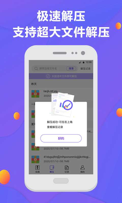解压缩这款软件可以快速的处理文件的格式以及文件的大小,可以帮助用户将超大型文件以更小的内存数据来存储,可以帮助我们提高对文件的处理效率。同时在这款软件上大家能够对于我们手机压缩好的压缩文件加上不同类型的密码,来进一步保障我们数据的安全性,这样我们只有输入到正确的密码才能够打开。