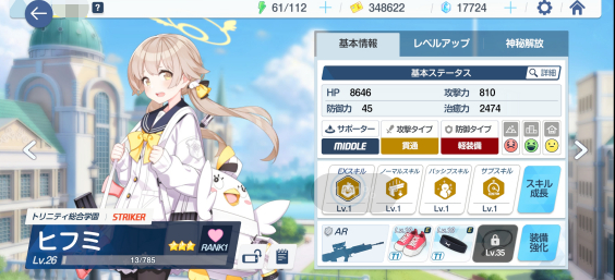 日奈的第一个技能是个范围性伤害技能,可以对面前的敌人造成伤害,伤害值很高。第二个技能则是一个辅助控制技能,可以对敌人施加眩晕效果。值得一说的是,这个眩晕效果的持续时间非常长,总计20秒。这个时间已经可以让敌人死上两回了。至于日奈的被动技能则是提升角色自身攻击力的,也是很不错的辅助技能。