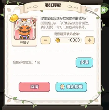 开通这个金币权限哦,被委托的好友就可以使用自己拥有的金币来购买装饰了,还有最重要的一点是,游戏中增加了存档功能,玩家们在委托装饰的时候,可以开设一个新的存档,让好友在新存档中进行装饰,方便玩家们选择,这些装饰的存档在等级树解锁后就可以使用了!
