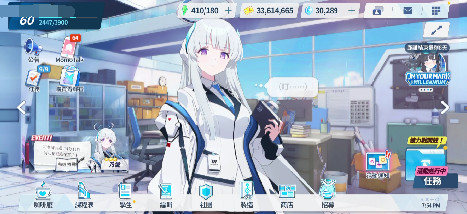 为了欢迎老师们的入职,游戏准备了丰富的入职活动,活动举办的最终时间到8月31日,只要在这期间连续登录7天就算完成了活动,并且每一天都可领取活动奖励,例如有青辉石、花束和情人节茶几。