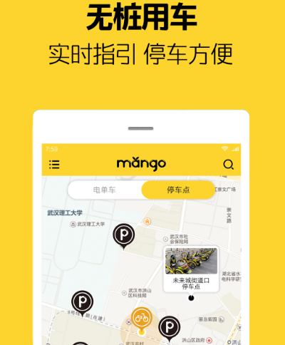 芒果电单车是武装共享电单车软件扫码出行,轻装上阵,画面简约,不需太过于繁杂的操作,可一目了然其中的内容和功能。预约用车比较方便,具有行车导航,当前附近没有车辆不用担心,打开导航之后可查询共享单车地点。由于这是武装用车软件,因此停车还车更加方便,不需来到偏远的地方随意停还。