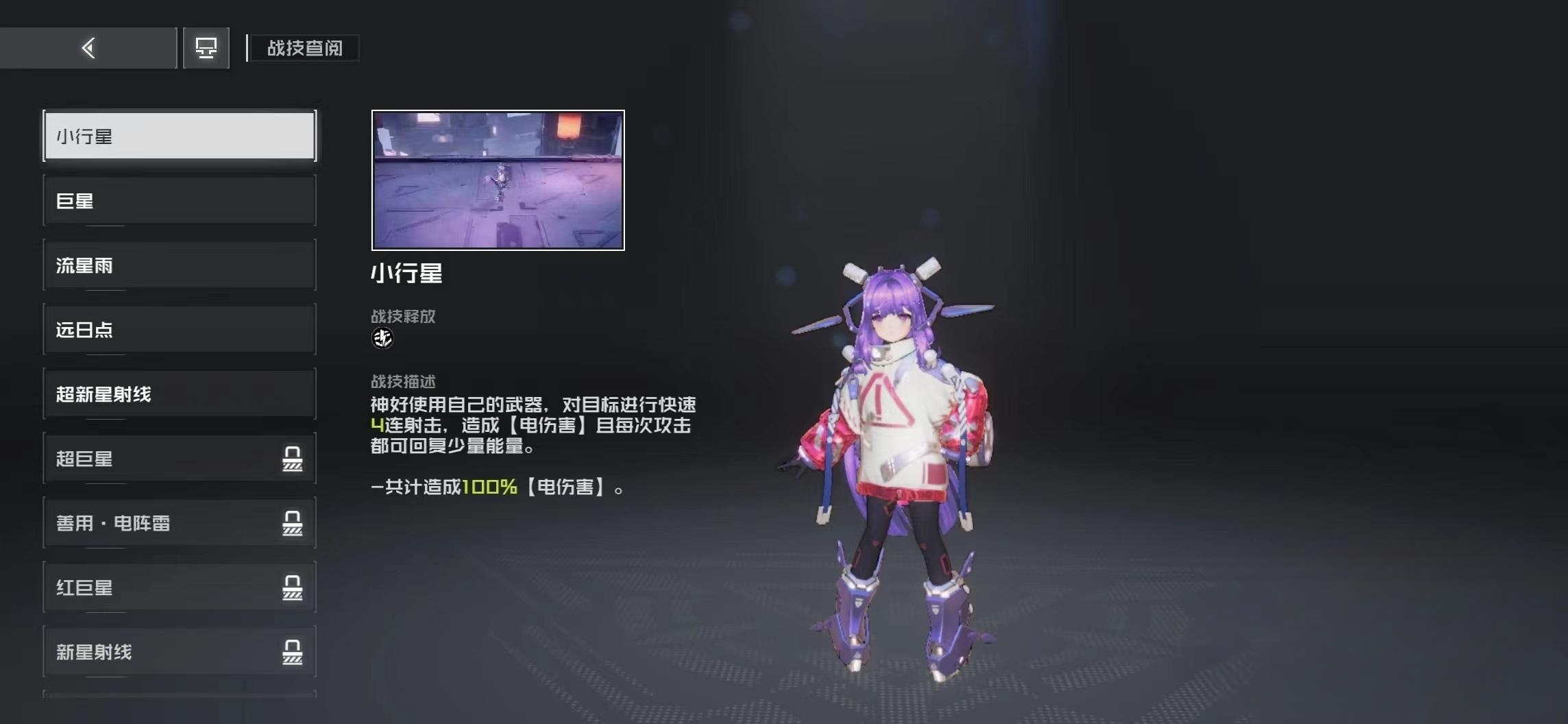技能方面,她的一技能是“小行星”,作为其常规输出手段,该技能的效果也是相当简洁明了,使用后可以对目标进行四次打击,共计会造成100%的电系伤害,并且每次打击都会恢复少量能量。该技能的伤害倍率非常一般,一倍的输出对于众多角色来说,都是十分常见的。