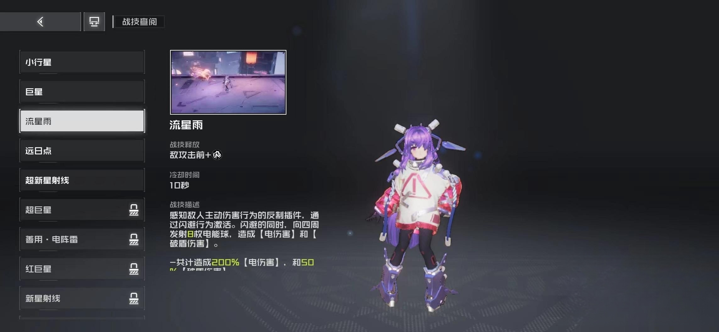 第二个技能是“流星雨”,这一技能需要抢在敌人攻击前进行施放,本身具有十秒钟的CD,它的性质更像是一个反制类的技能,只要闪避了敌人的攻击,便可顺势激活技能效果以此对周围发射“电能球”,这些电能球不仅可以造成高额的电伤害,还能对敌人的护盾进行额外创伤。