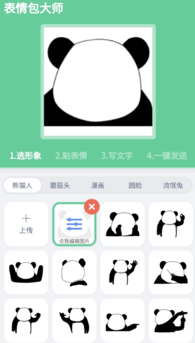 表情包大师app是一款好用的制作表情包软件。在制作表情包上有着很多的功能,首先可以对表情包的形象进行选择,有着热门的熊猫人、蘑菇头等形象供用户选择。选完形象之后就可以进行表情选择,有着很多热门表情包中的面部表情,还可以在表情包上写一些文字,文字的颜色也是让用户自行选择。