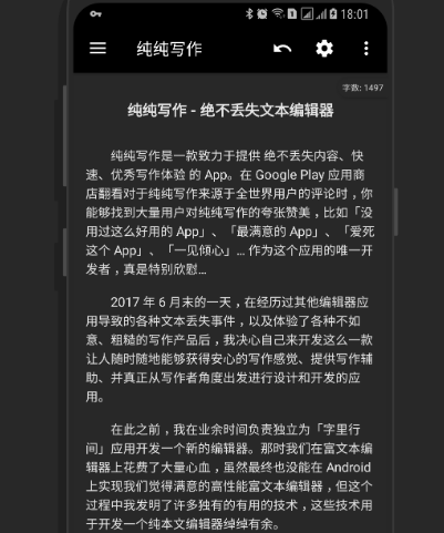 该软件可帮助小伙伴们专注又纯粹的写作,作为让人心安的写作应用,反应速度极快,感受丝滑流畅写作体验,非常适合小说及文章等各种编辑,另外还可当做日常记事本来使用。可畅想未来,将遥远的未来梦想编辑成一篇文章,另外还可通过写作的方式回忆曾经。为了解决各种写作问题,其中有强大的功能,比如传文本编辑器,使用编辑器可直接排版,另外还能添加颜色,对文字进行加粗等等。