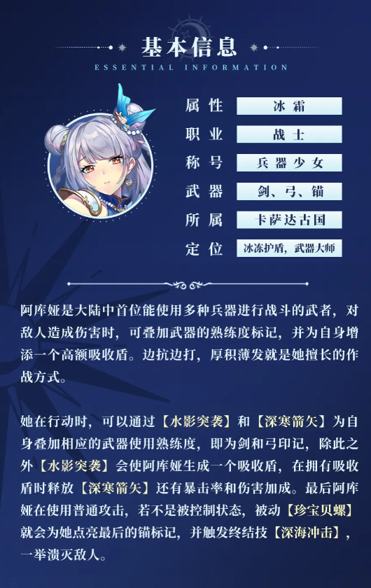 从属性和职业上来看阿库娅属于冰霜战士,可见她主要擅长的是近身作战,并且具有一手不俗的元素伤害能力,而从她的称号和武器不难看出其技能定然会使用多种攻击手段,官方给出的定位则是冰冻护盾和武器大师,所以不难判断该角色属于攻防一体的角色,并且能根据战局情况使用做种不同武器来进行合理应对。