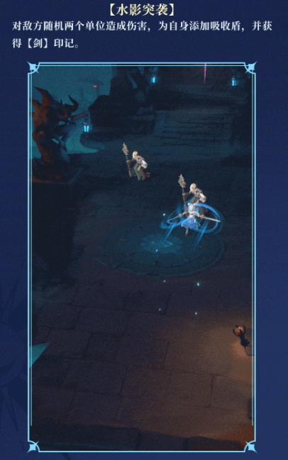 技能这块她主要有三个,第一个是“水影突袭”,该技能可以对随机两名敌人造成伤害,之后会为自身提供护盾和“剑”印记,该技能的作用还是十分全面的,不仅可以造成可观的AOE伤害,而且还兼具生存能力和增益能力,其中这个护盾能够抵消敌人的大量火力,不仅保护了自己,也间接避免了后排的队友受到伤害。另外剑印记还可以强化之后的攻击,以此造成更高的近战伤害,同时触发暴击的话也会打出更高的爆发。