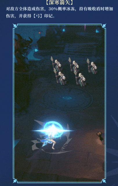 第二个技能则是“深寒箭矢”,它同样属于AOE伤害技能,不过作用的范围从两名敌人变成了全体敌人,并且该技能与水影突袭还存在一定联动效果,只要你的身上有护盾,那么它就可以获得额外增伤,而这个增伤的效果对于敌人来说是十分致命的,因为它作为一个全体伤害技能只要数值上去了那么很容易就能做到压低对方全队的血线。