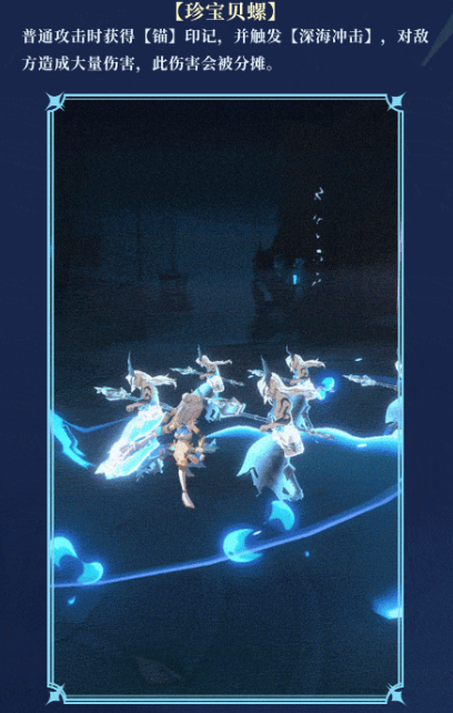 第三个则是“珍宝贝螺”,它与前两个技能不太一样,并不需要主动施放,只用普攻即可完成触发,触发后阿库娅会获得锚印记,这个印记能够让她的普攻触发“深海冲击”,这一效果同样属于输出类的效果,触发后阿库娅会冲向敌认随后进行四次挥打,外加一次跳起之后的向下砸击,这五次攻击每次伤害都非常出色,并且它不只会伤害到单体敌人,还会通过分摊方式伤害到身边的伙伴。