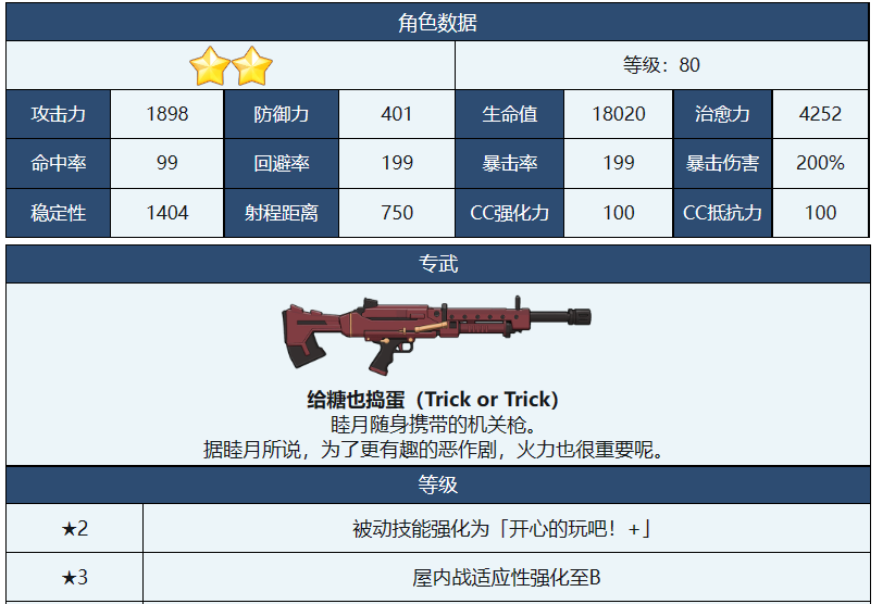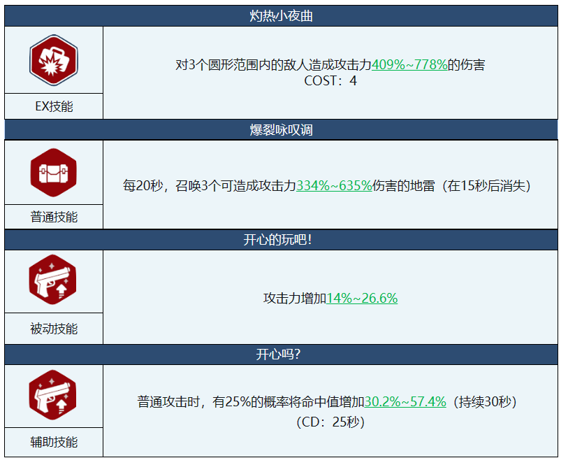 她的技能有以下几个特点:EX技名曰灼热的小夜曲。开启后可以对多个大跨径aoe内的敌人造成持续输出,如果这一些aoe区域有重合的区域的话,伤害还可以再次叠加。这个技能的释放范围非常不错,甚至能直接打到后排敌人,而且伤害倍率很高,也是睦月最强的技能。普通名叫爆裂的咏叹调。睦月每20秒可以设置三个地雷,每个地雷在15秒后消失。每个地雷都是单独计算伤害的,而且可以暴击。但是这个技能的缺点是地雷丢得比较靠前,不容易打到敌人,需要一些角色配合才能发挥效果。被动技:来尽情玩耍吧!和要去找点乐子吗?这两个被动技能都可以增加睦月的攻击力和命中值,提高她的输出能力。