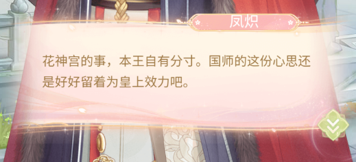 这一关遇到了【凤炽】,国师和凤炽经过了一番激烈的言论之后就分开了,国师在后院遇到了正在吐槽唐婉儿的林初月,两人决定合作,第二天系统夭夭说希望唐宛儿早点去花园与【顾九思】相遇,这一关玩家们可能会有点乏力,玩家们需要灵力拥有4584点才可以战斗胜利哦!