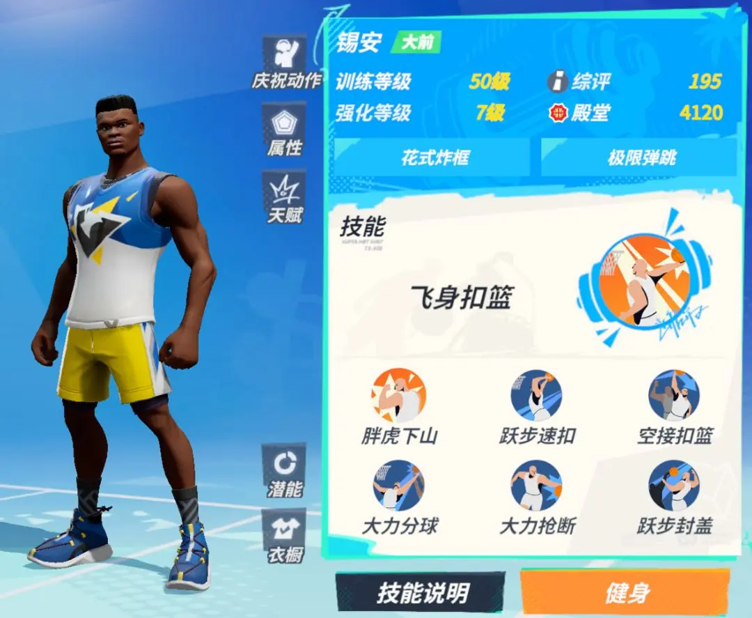 锡安:他的扣篮能力出众,并且属性层面还有着整个游戏数一数二的力量,所以正面对抗时基本永远不会落入下风,爆发技是一个主动施放的技能“飞身扣篮”,锡安在进入三秒区时可以使用它来直接飞起扣篮,通过升级强化还可以提升扣篮命中率和抗盖帽,一般的中锋根本没法防下他。
